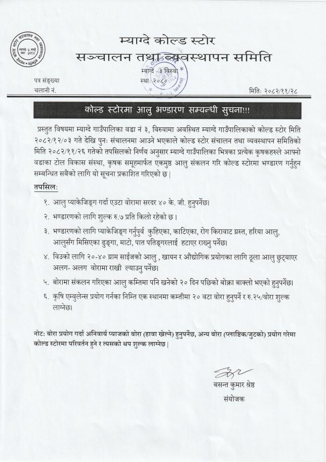 म्याग्दे कोल्ड स्टोरको एक च्याम्बर भाडामा सञ्चालन सम्बन्धि सूचना।