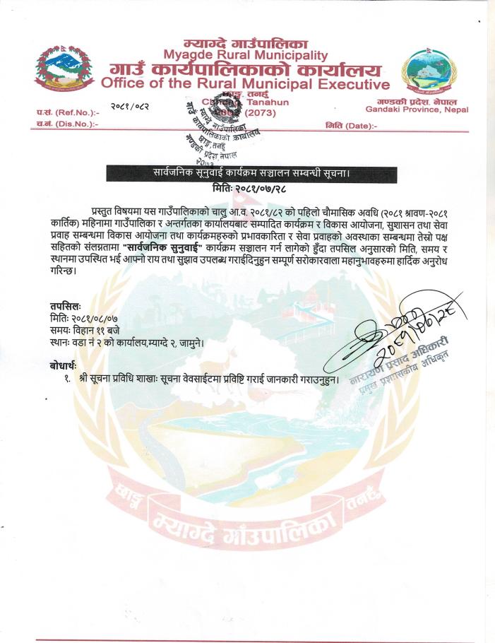 आ.व.२०८१/८२ को पहिलो चौमासिक सार्वजनिक सुनुवाई सञ्चलन सम्बन्धी सूचना।