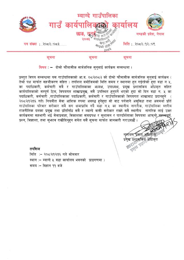 » आ.व. २०८२/८३ को दोस्रो चौमासिक सार्वजनिक सूनुवाई सम्बन्धि सूचना।