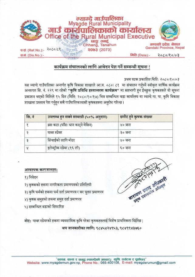 कृषि शाखाः कृषि प्राविधिक हस्तान्तरण कार्यक्रम सम्बन्धि सूचना।