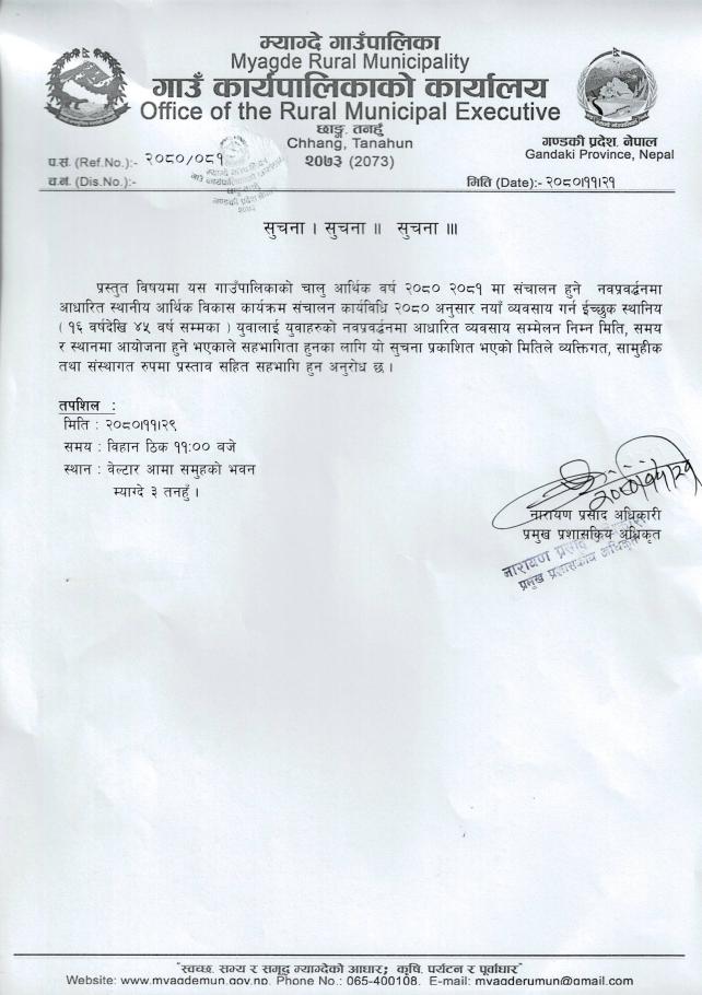 नवप्रवर्द्धनमा आधारित स्थानीय आर्थिक विकास कार्यक्रम अन्तर्गत युवा व्यवसाय सञ्चालन गर्ने सम्बन्धि सूचना।