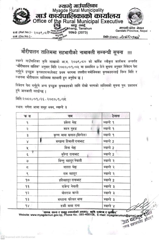 मौरीपालन तालिममा सहभागी हुने कृषकहरुको विवरण सम्बन्धी सूचना।