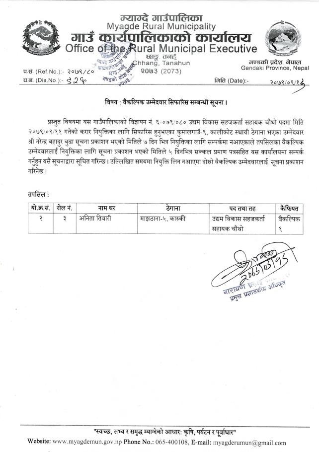 वैकल्पिक उम्मेदवार सिफारिस भएको सम्बन्धि सूचना।