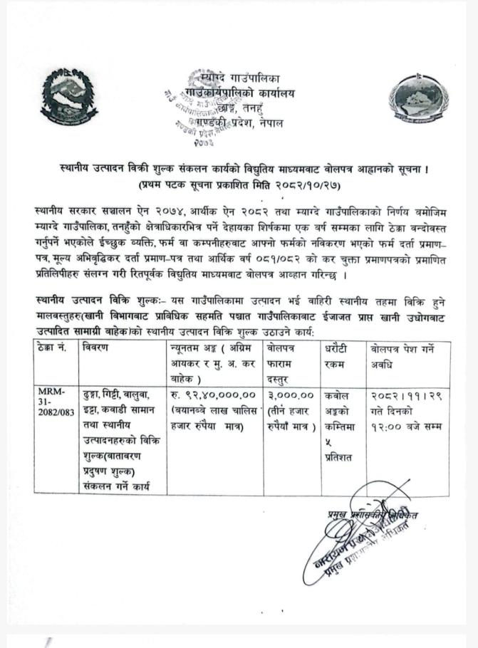 » स्थानीय उत्पादन विक्रि शुल्क उठाउने कार्यको बोलपत्र आव्हान सम्बन्धि सूचना।